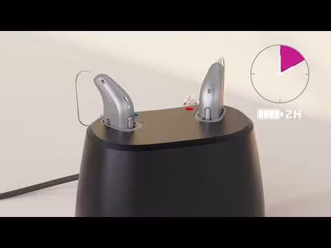 Den nya laddaren för Oticon Intent miniRITE är omdesignad från grunden för att ge en snabb, stabil och diskret laddningsupplevelse. Med förbättrad kontaktladdningsteknik erbjuder den snabbaste laddningen för Oticons hörapparater hittills. Kontaktladdning är snabbare än induktiv laddning och ger pålitlig, effektiv laddning. När hörapparaterna sitter rätt och LED-indikatorerna lyser orange, sker laddningen med full kapacitet. Den snabba och flexibla laddningen ser till att Oticon Intent är fulladdad och redo för varje anpassningssession eller firmwareuppdatering.