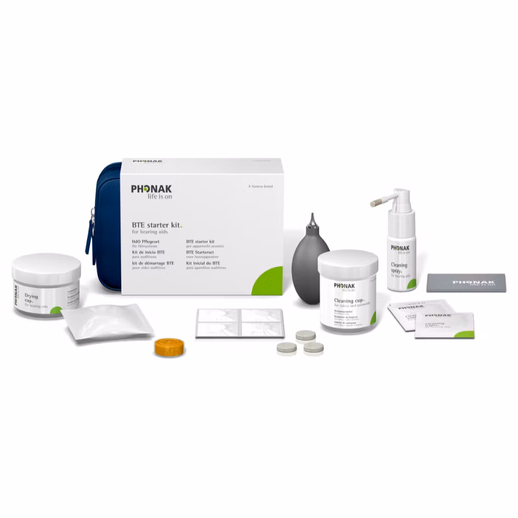 Rengöringskit för rengöring av BTE-hörapparater med formgjuten insats. Kitet innehåller allt du behöver för rengöring och skötsel av dina bakom-örat-hörapparater.
