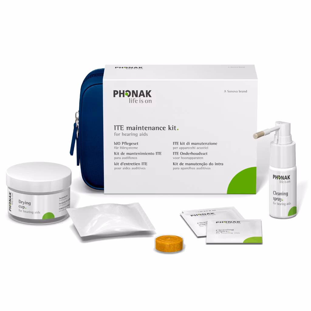 Rengöringskit för rengöring av ITE-hörapparater. Kitet innehåller allt du behöver för rengöring och skötsel av dina i-örat-hörapparater.